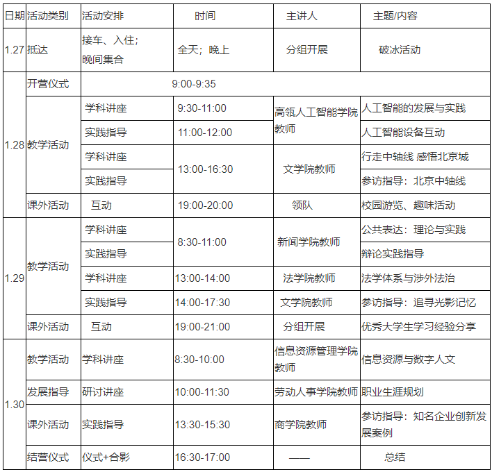 拟定课程参照下表。如遇特殊情况,学院可根据实际情况对课程时间和内容安排做出适当调整。