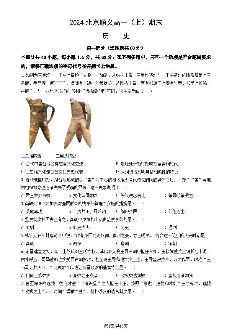 2023-2024学年北京顺义区高一上学期期末历史试题及答案