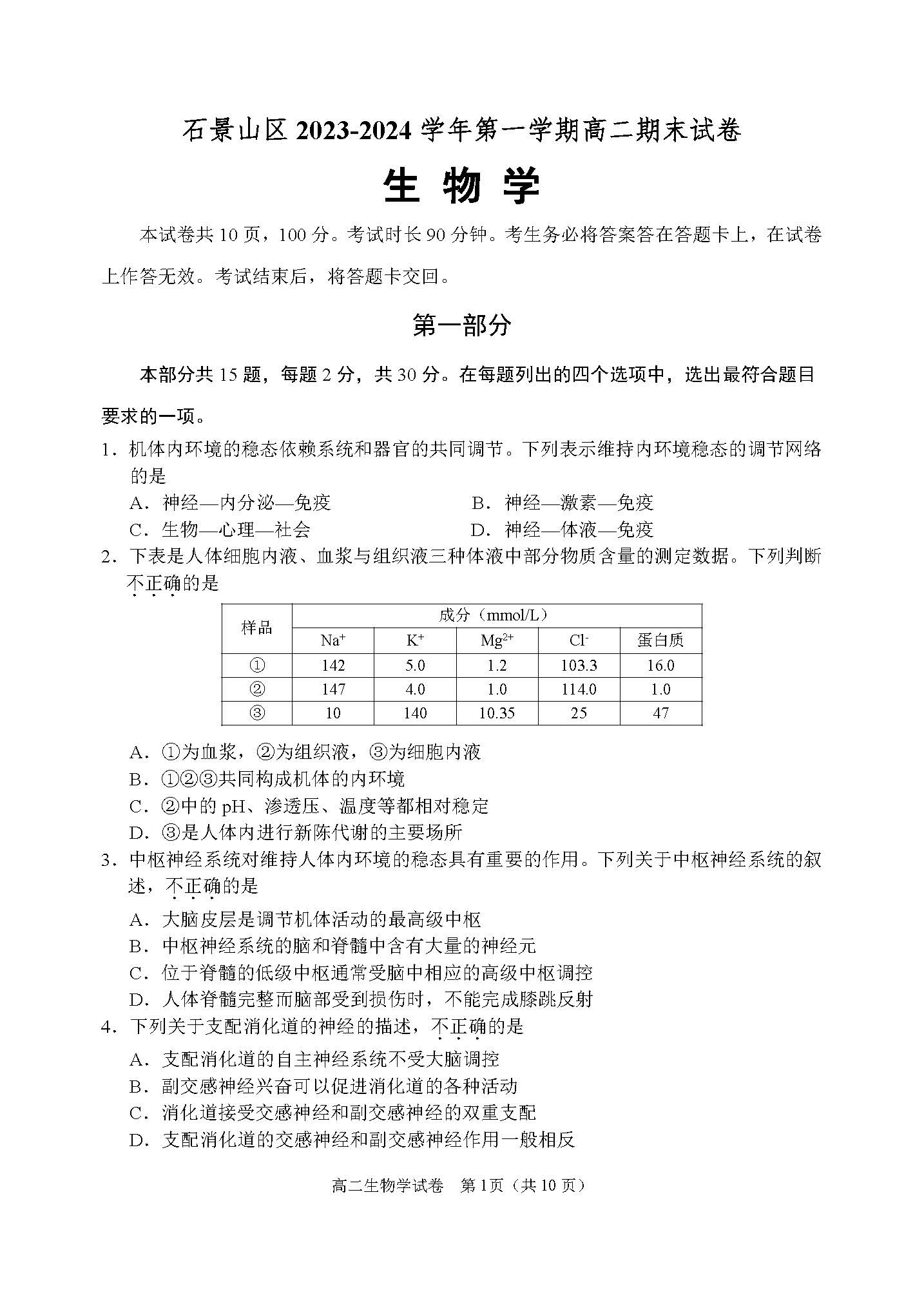 2023-2024学年北京石景山区高二上学期期末生物试题及答案