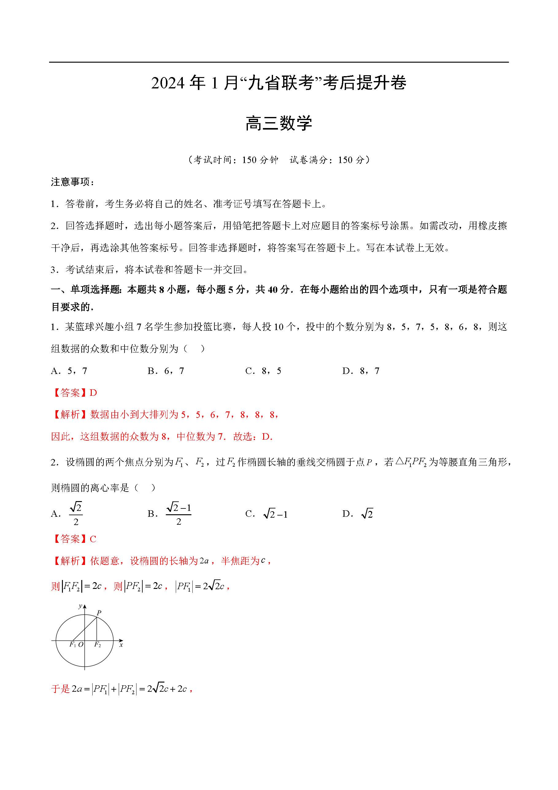 2024年1月中旬,2024年新高考九省联考如期举行。考试结束后,湖南、湖北等省份发布公告,确定2024年新高考数学将采用新的试卷结构。为方便大家更好的备考,北京高考在线团队收集到一份2024年1月九省联考考后提升卷数学试题答案,练习本套试题的考生可以核对参考。
