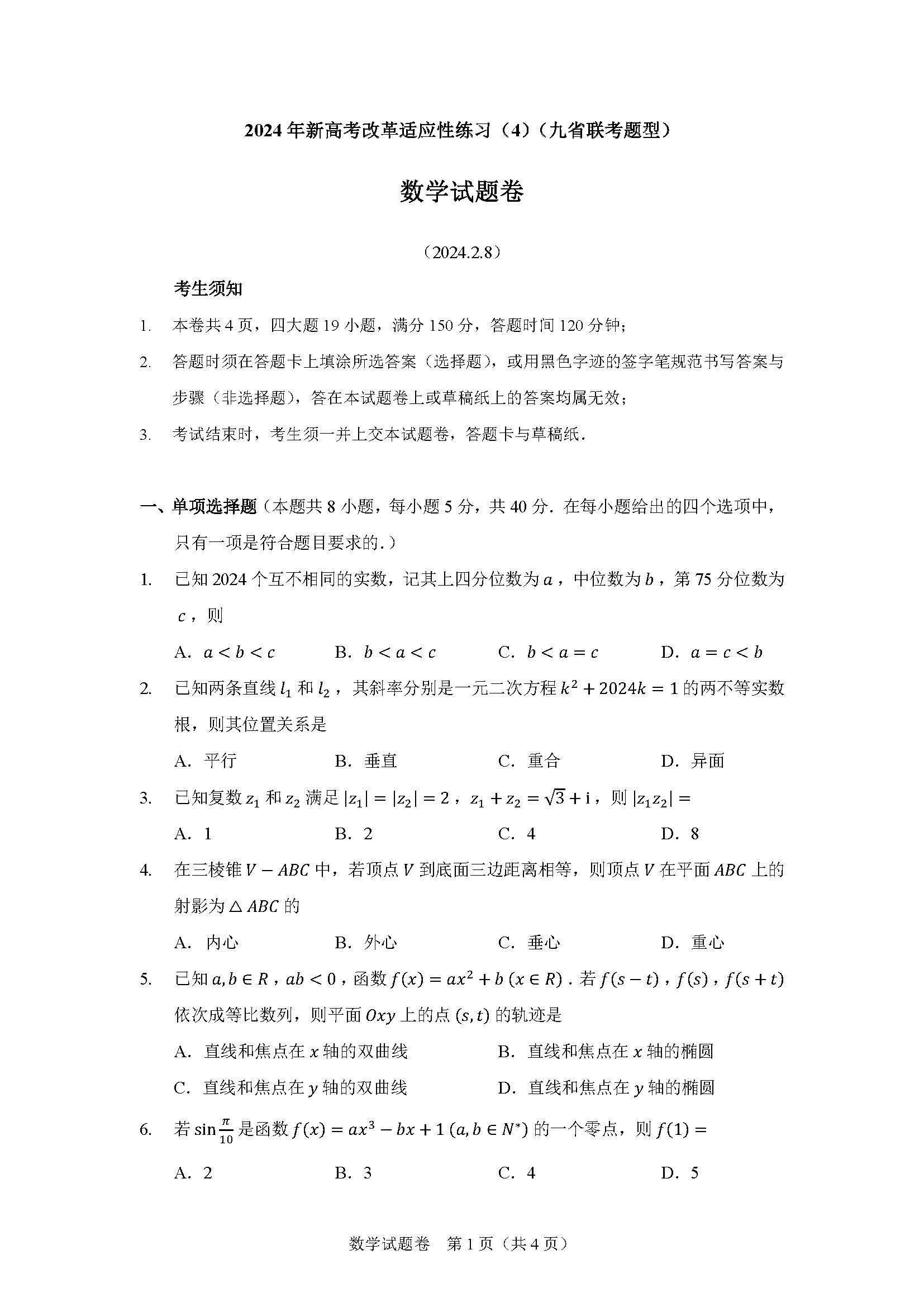 立即下载:2024年新高考改革适应性练习数学试题(4)(九省联考题型)