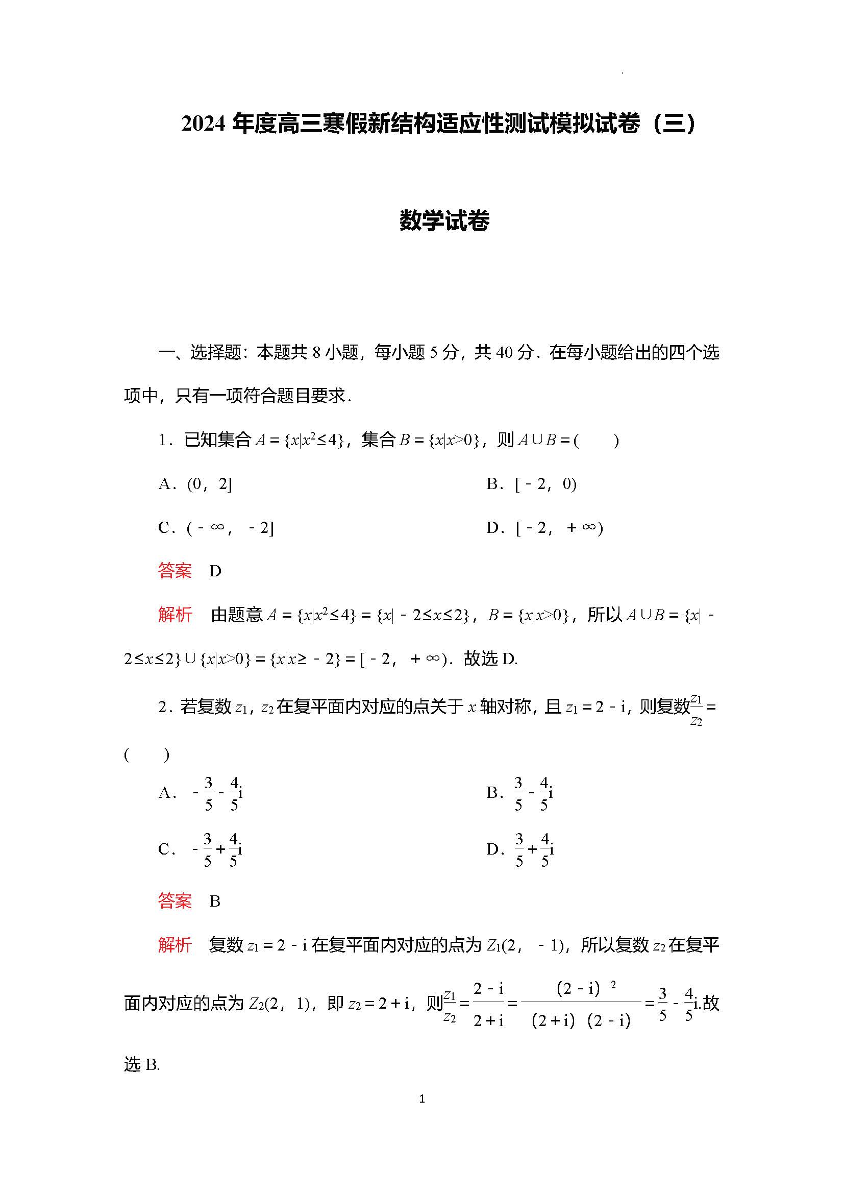 立即下载:2024年度高三寒假新结构适应性测试模拟数学答案(三)