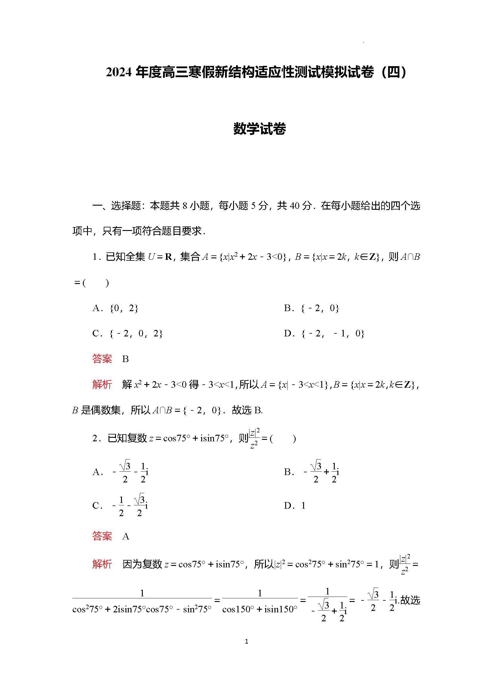 根据最新消息,广东、湖南、湖北等多个省份发布通知,确定数学和外语采用新试卷题型。为帮助大家练习备考,北京高考在线团队整理了多套2024年度高三寒假新结构适应性测试模拟数学试题,本文分享数学答案(四)。