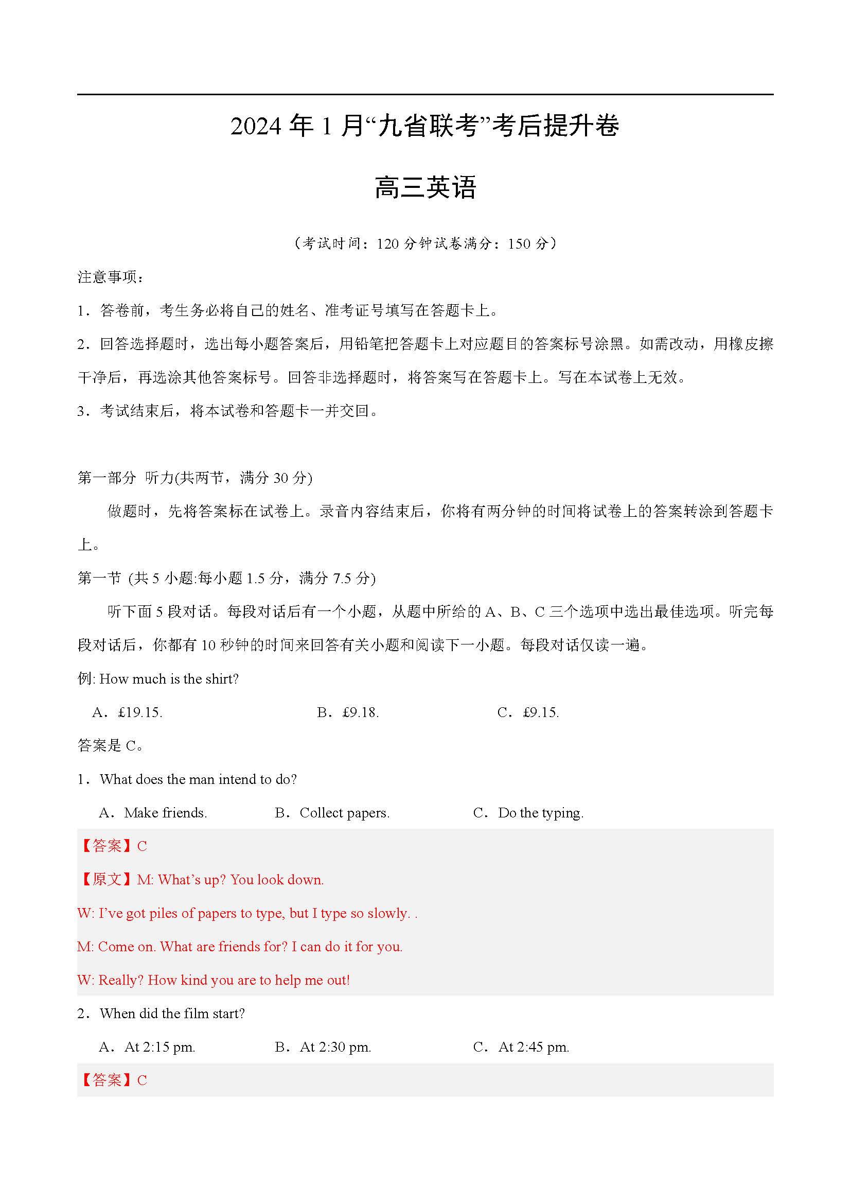2024年1月中旬,2024年新高考九省联考如期举行。为方便大家更好的备考,北京高考在线团队收集到一份2024年1月九省联考考后提升卷英语答案,分享给大家核对参考。