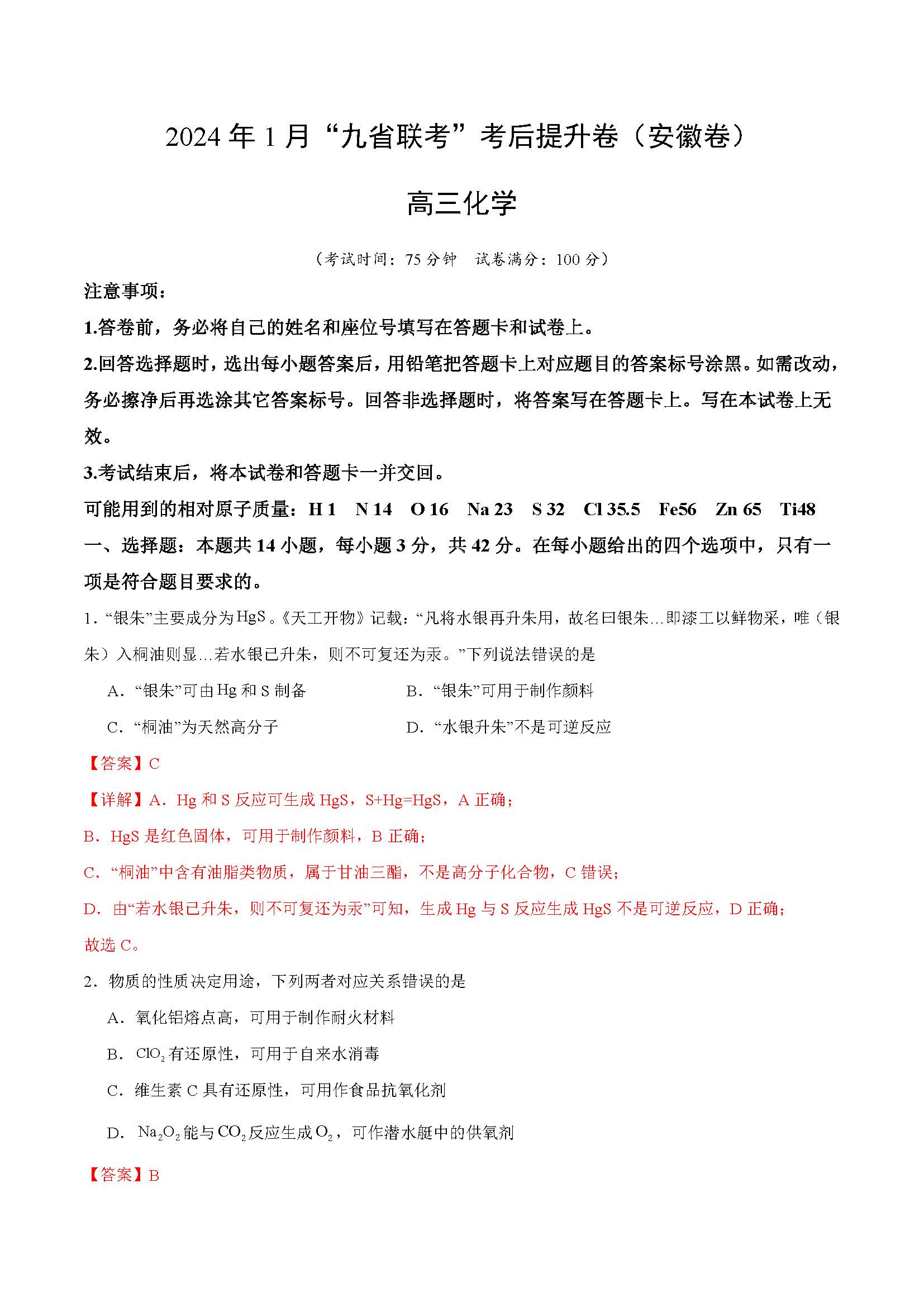 立即下载:2024年1月九省联考考后提升卷化学答案(安徽卷)