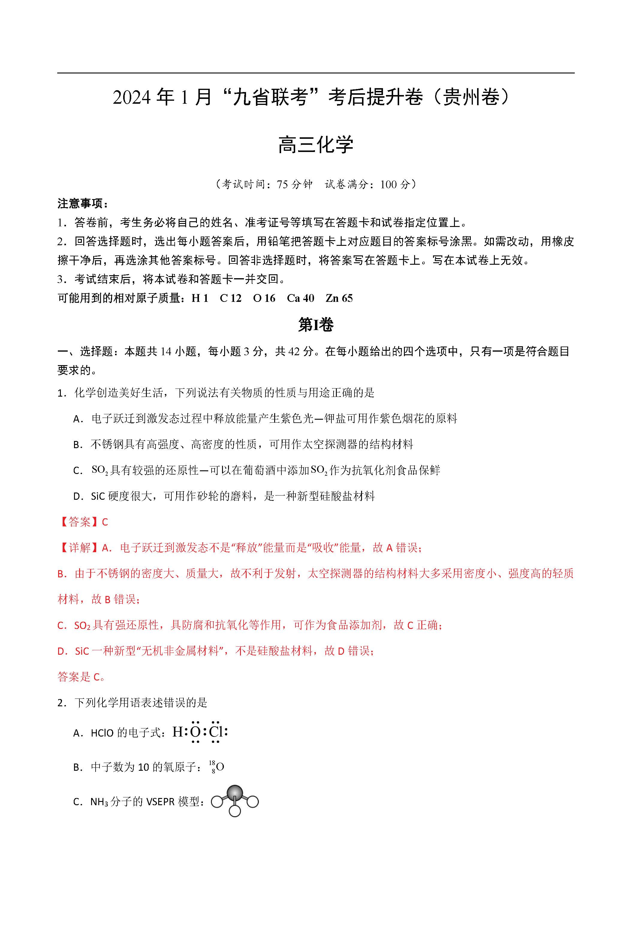 立即下载:2024年1月九省联考考后提升卷化学答案(贵州卷)