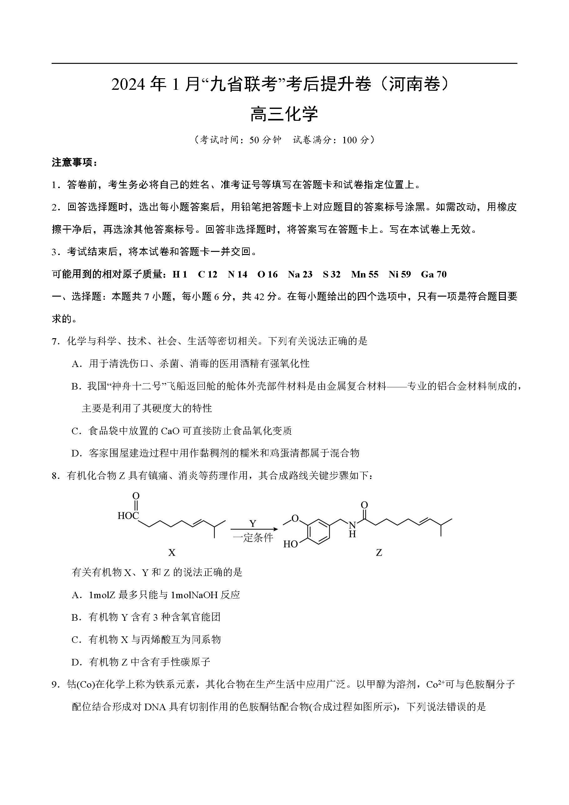 2024年1月九省联考考后提升卷化学试题(河南卷)