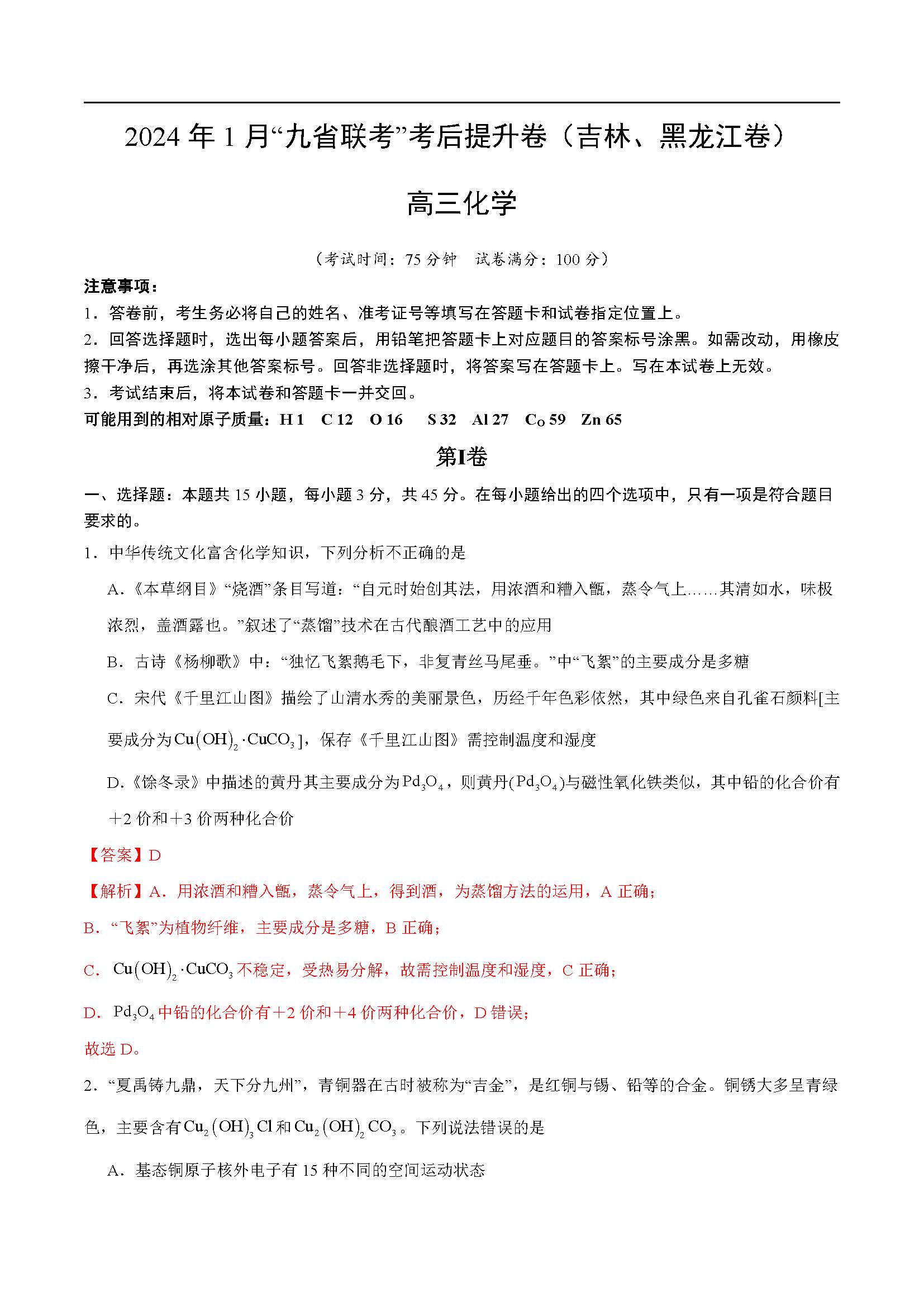 立即下载:2024年1月九省联考考后提升卷化学答案(吉林、黑龙江卷)