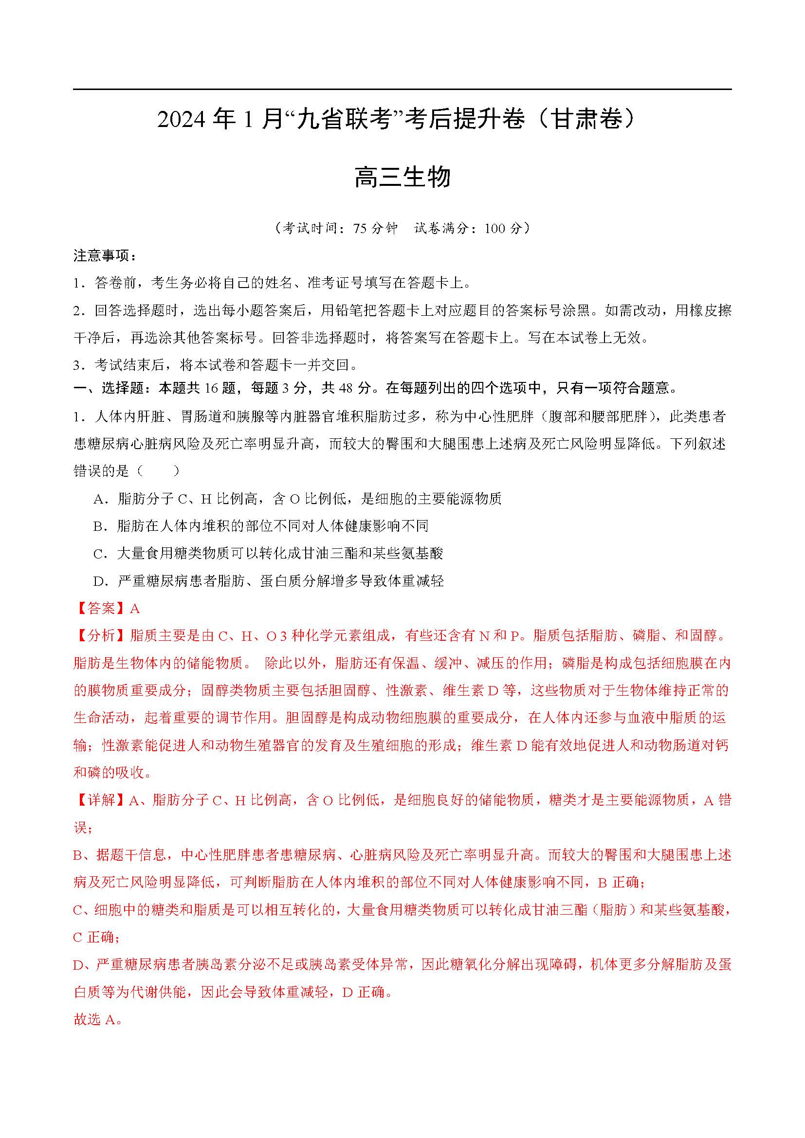 立即下载:2024年1月九省联考考后提升卷生物答案(甘肃卷)