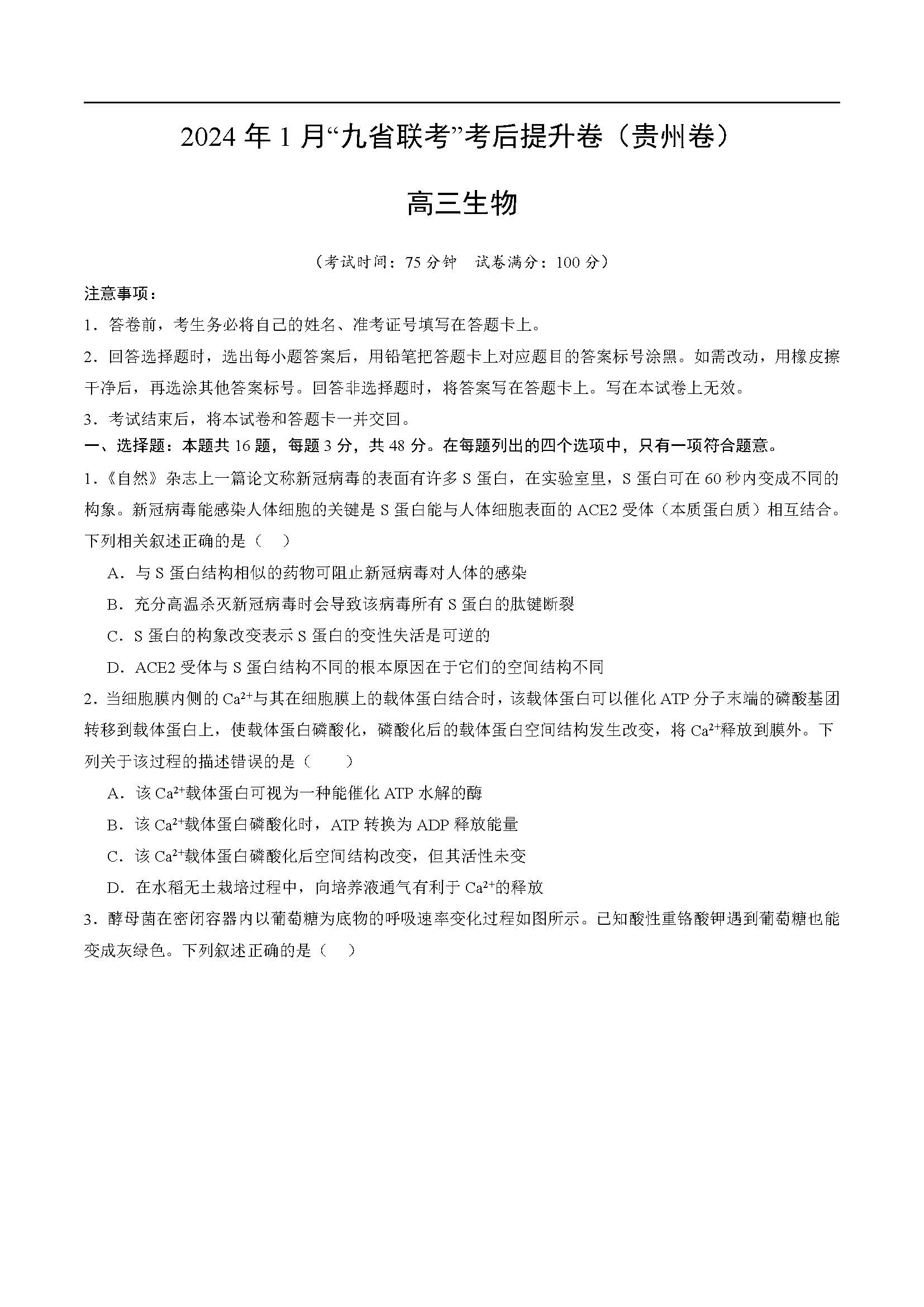 2024年1月中旬,2024年新高考九省联考如期举行。为方便大家更好的备考,北京高考在线团队收集到一份贵州卷2024年1月九省联考考后提升卷生物试题,供大家练习。