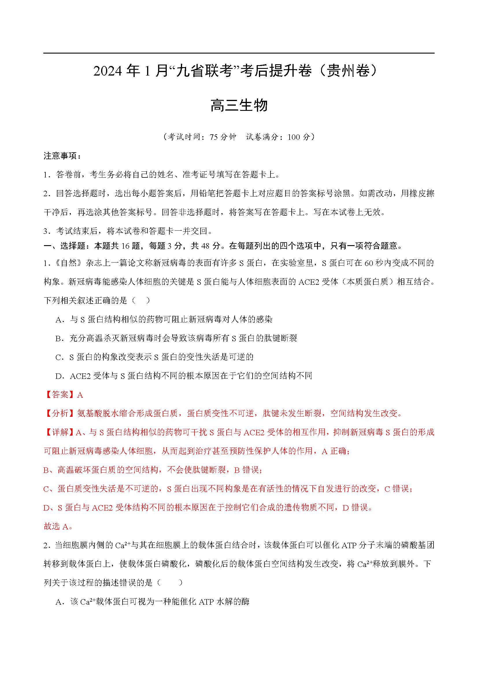 立即下载:2024年1月九省联考考后提升卷生物答案(贵州卷)