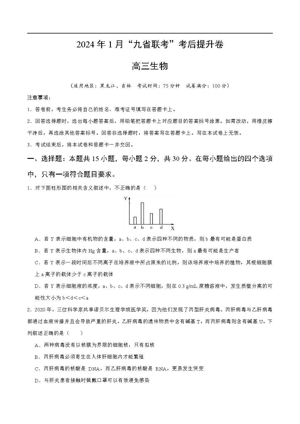 立即下载:2024年1月九省联考考后提升卷生物试题(吉林、黑龙江卷)