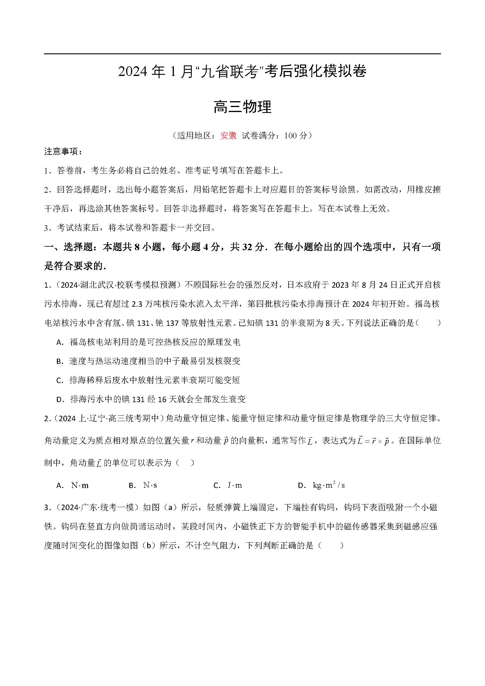 立即下载:2024年1月九省联考考后提升卷物理试题(安徽卷)