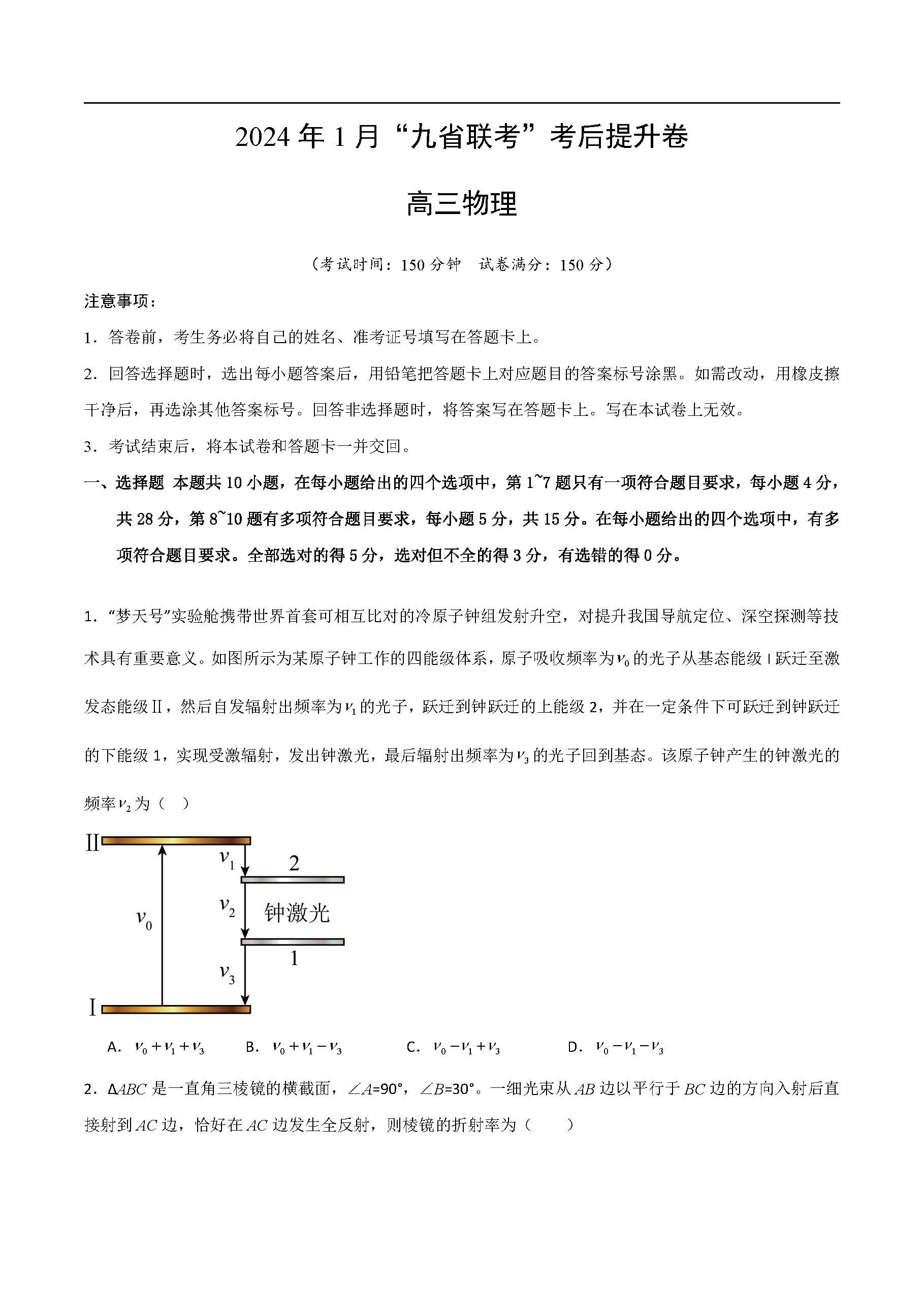 立即下载:2024年1月九省联考考后提升卷物理试题(贵州卷)