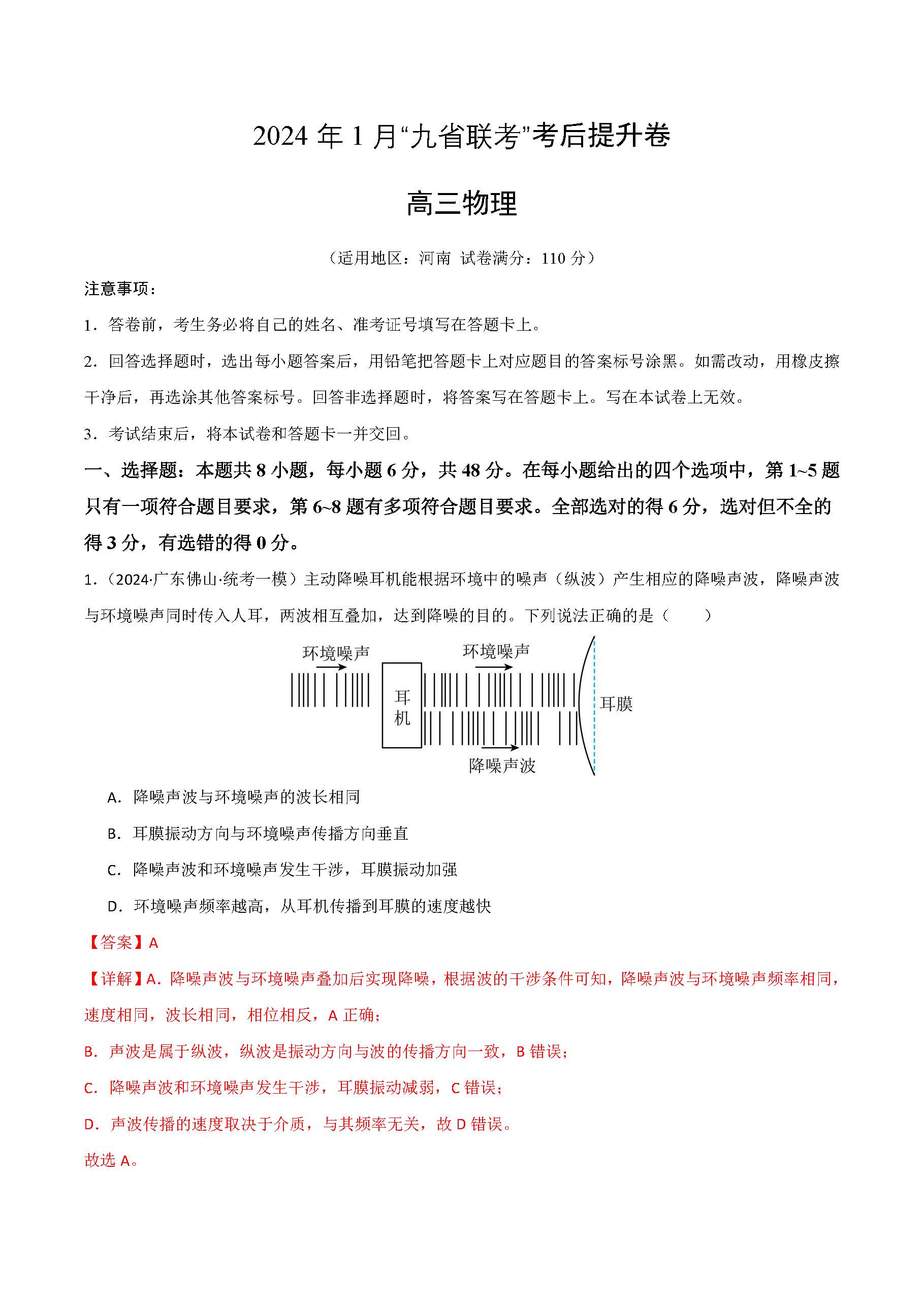 2024年1月九省联考考后提升卷物理答案(河南卷)