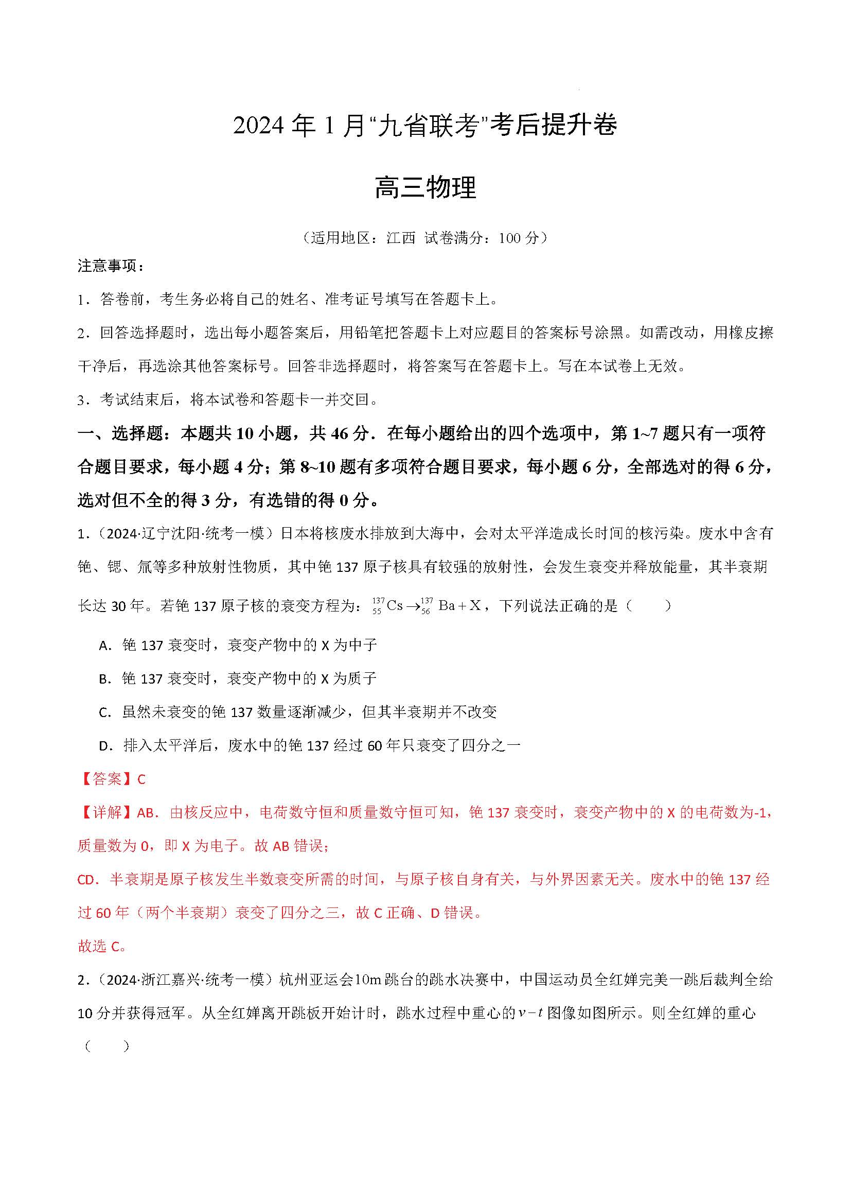 立即下载:2024年1月九省联考考后提升卷物理答案(江西卷)