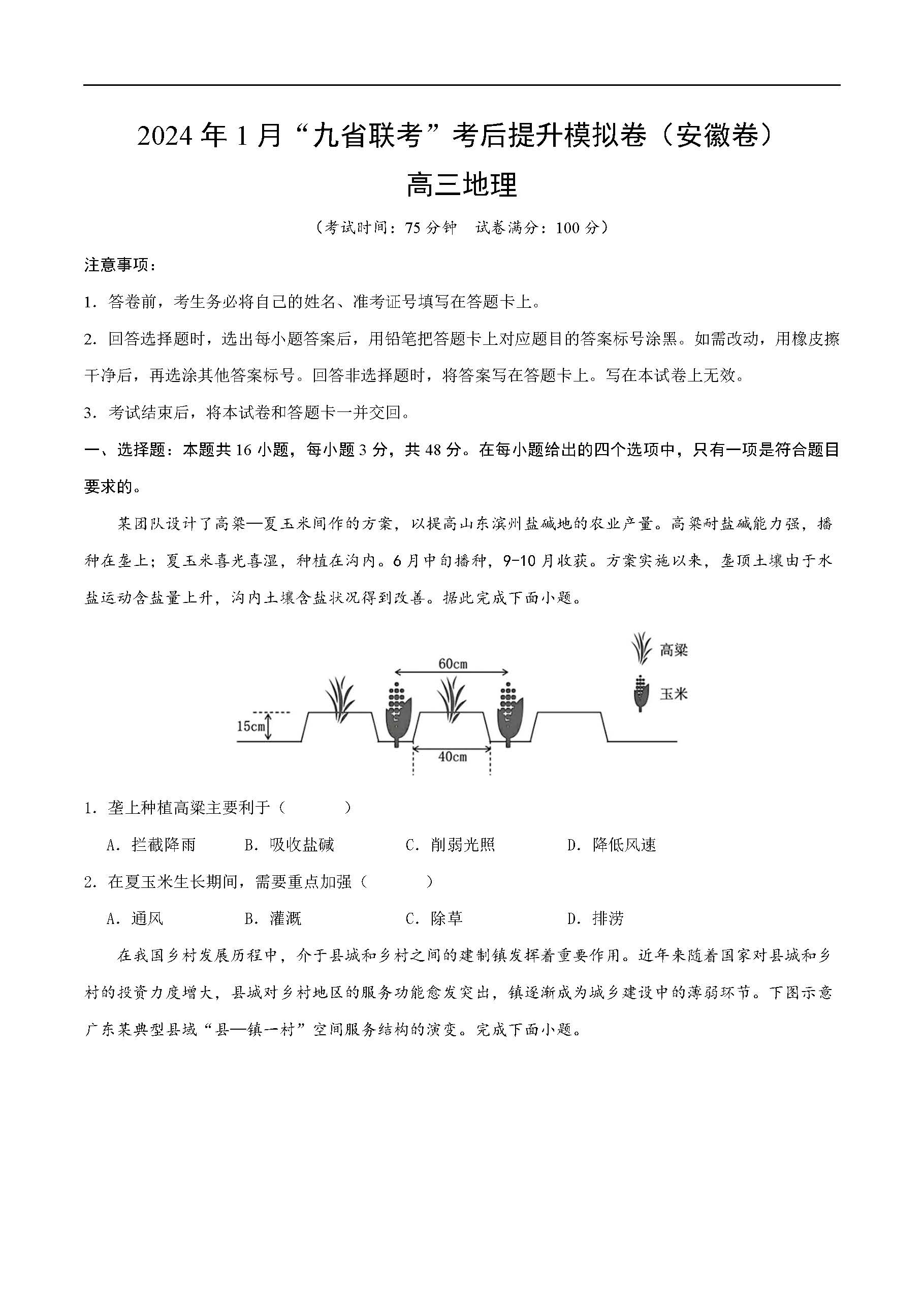 2024年1月九省联考考后提升卷地理试题(安徽卷)