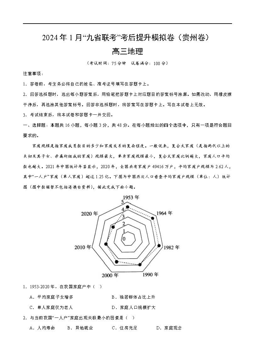 2024年1月九省联考考后提升卷地理试题(贵州卷)