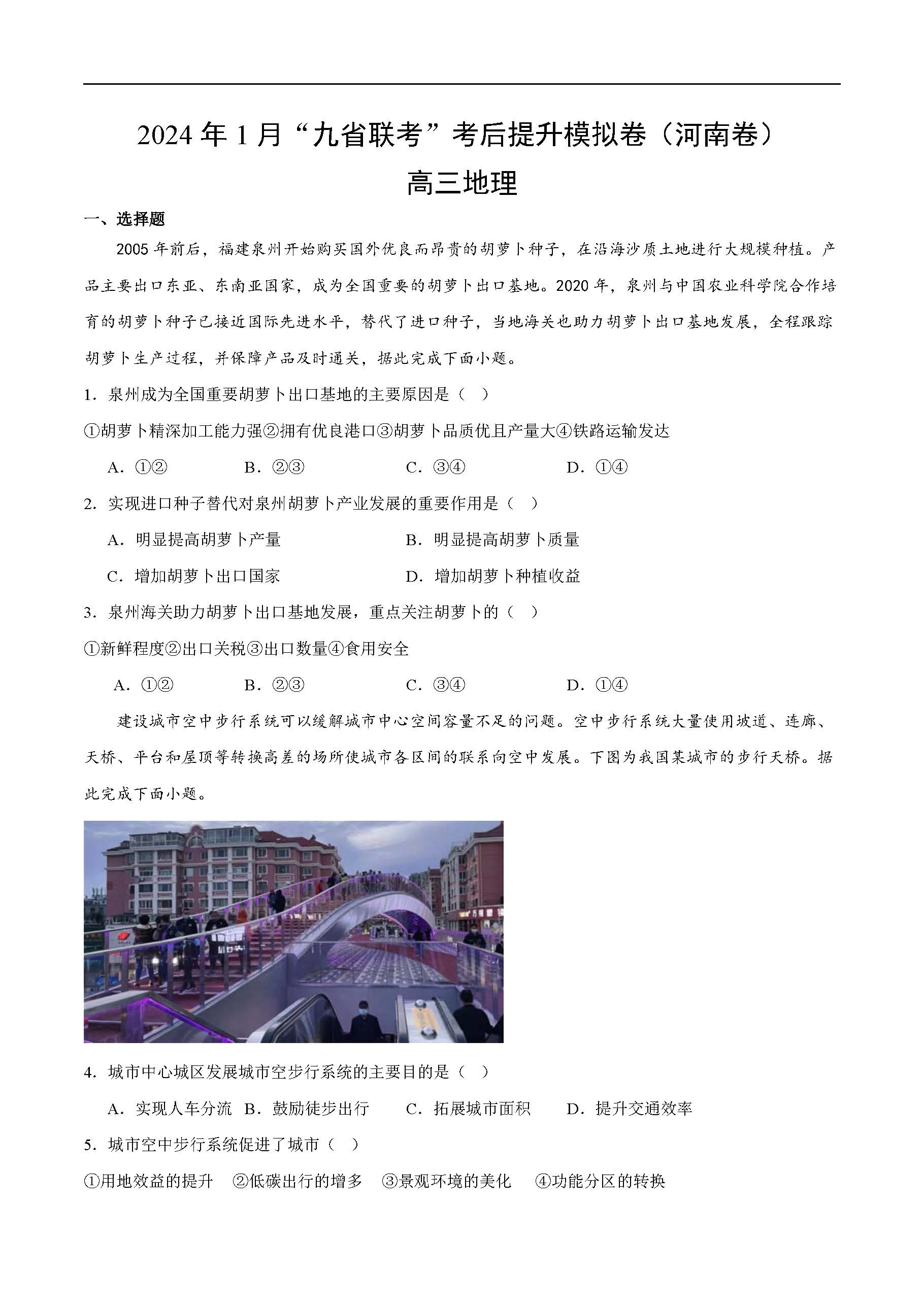 2024年1月九省联考考后提升卷地理试题(河南卷)
