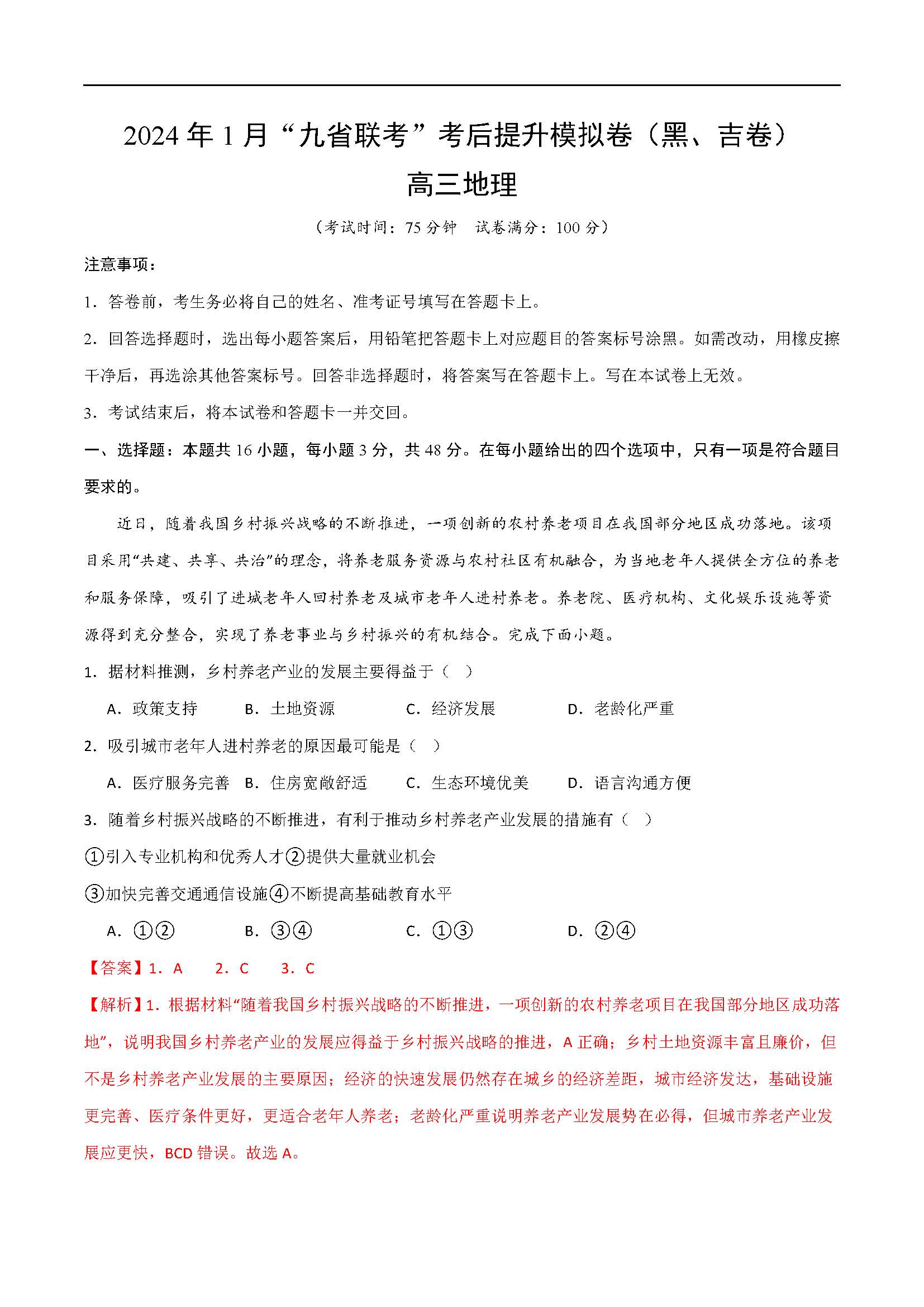 2024年1月九省联考考后提升卷地理答案(吉林、黑龙江卷)