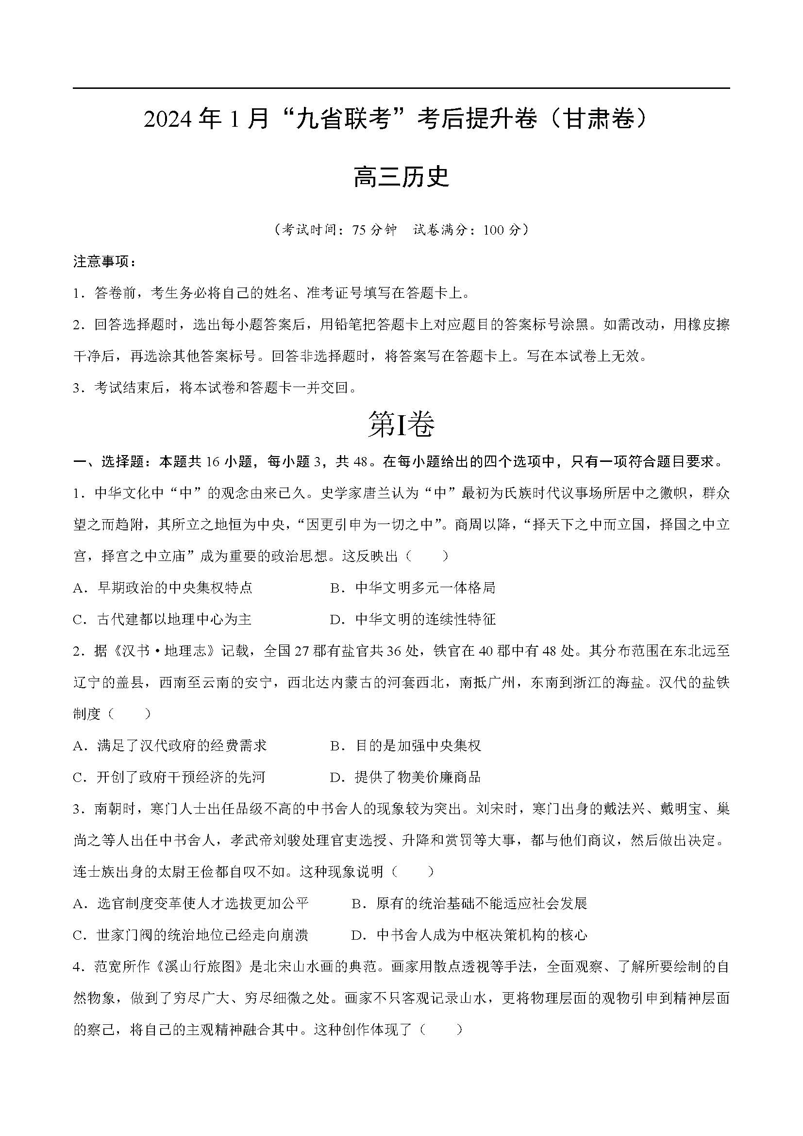 2024年1月九省联考考后提升卷历史试题(甘肃卷)