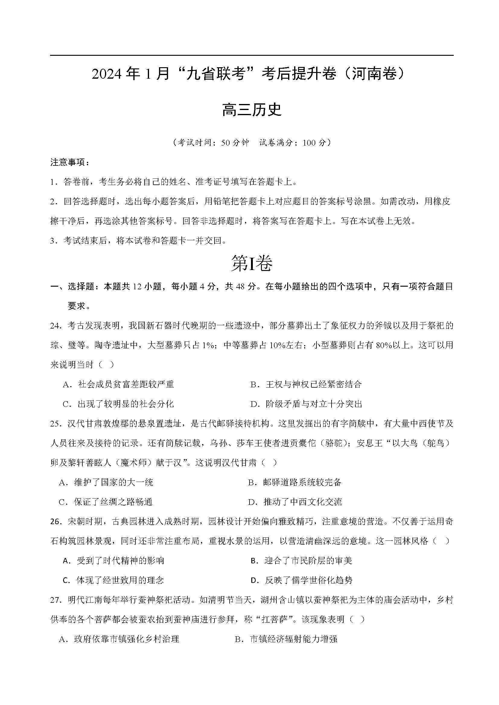 2024年1月九省联考考后提升卷历史试题(河南卷)