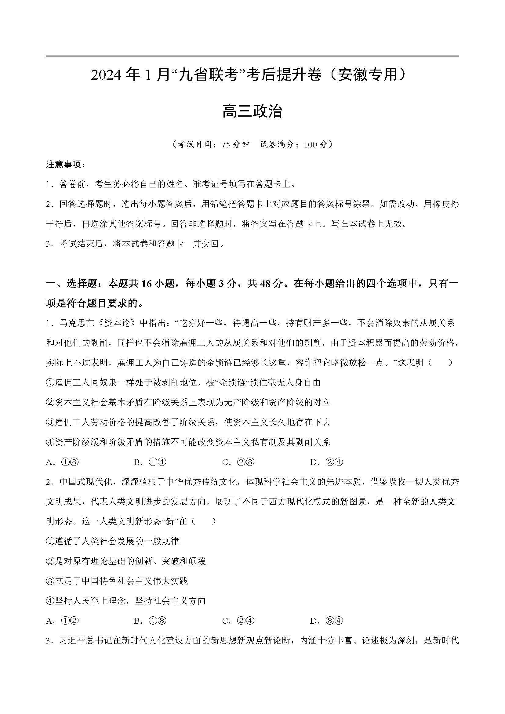 2024年1月九省联考考后提升卷政治试题(安徽卷)