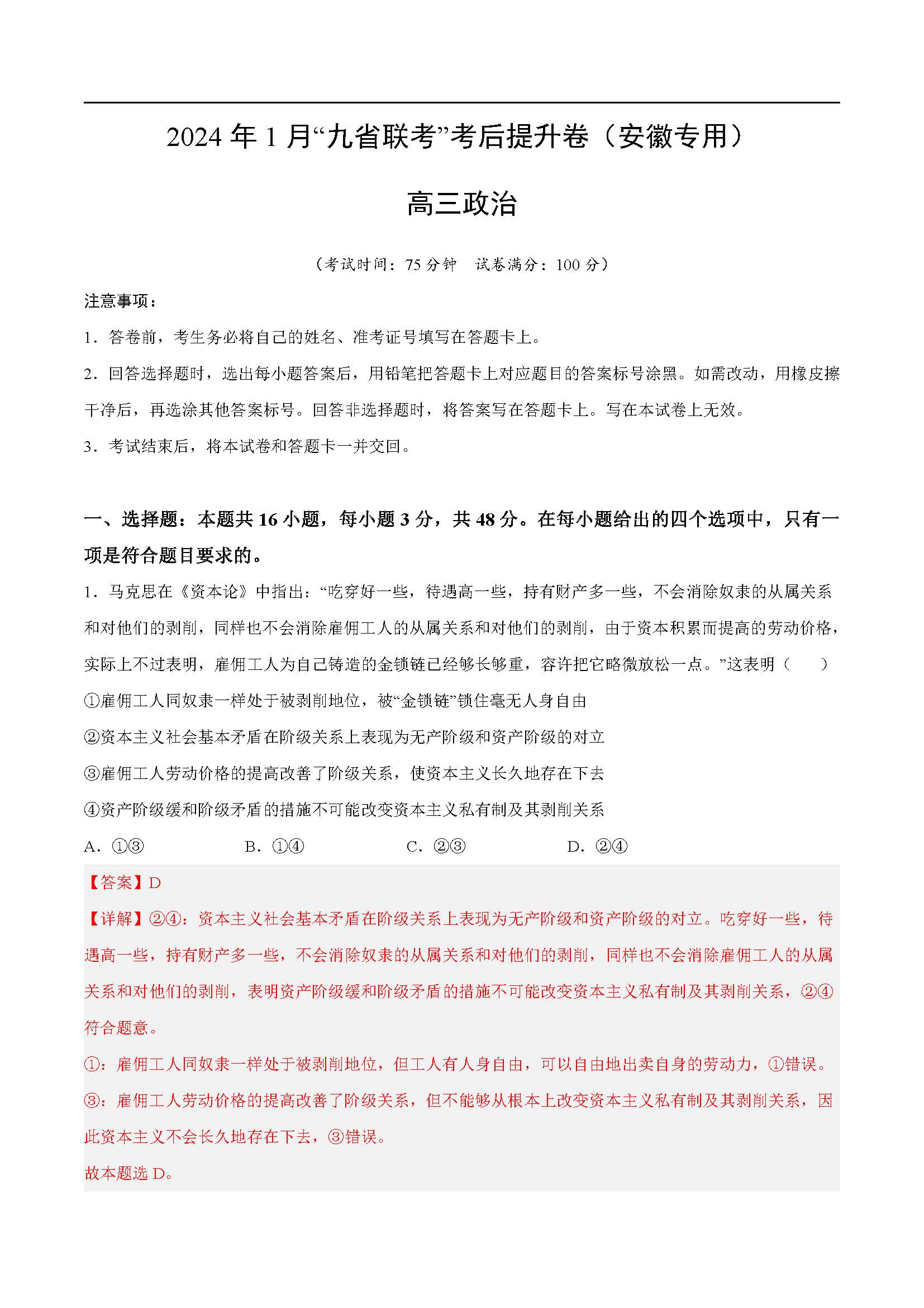立即下载:2024年1月九省联考考后提升卷政治答案(安徽卷)