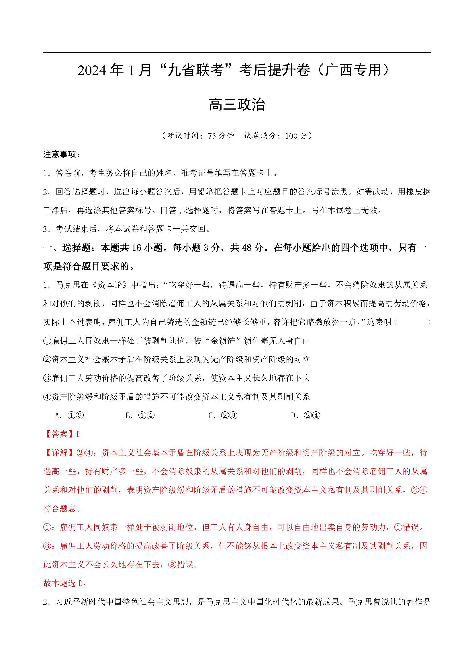 2024年1月九省联考考后提升卷政治答案(广西卷)