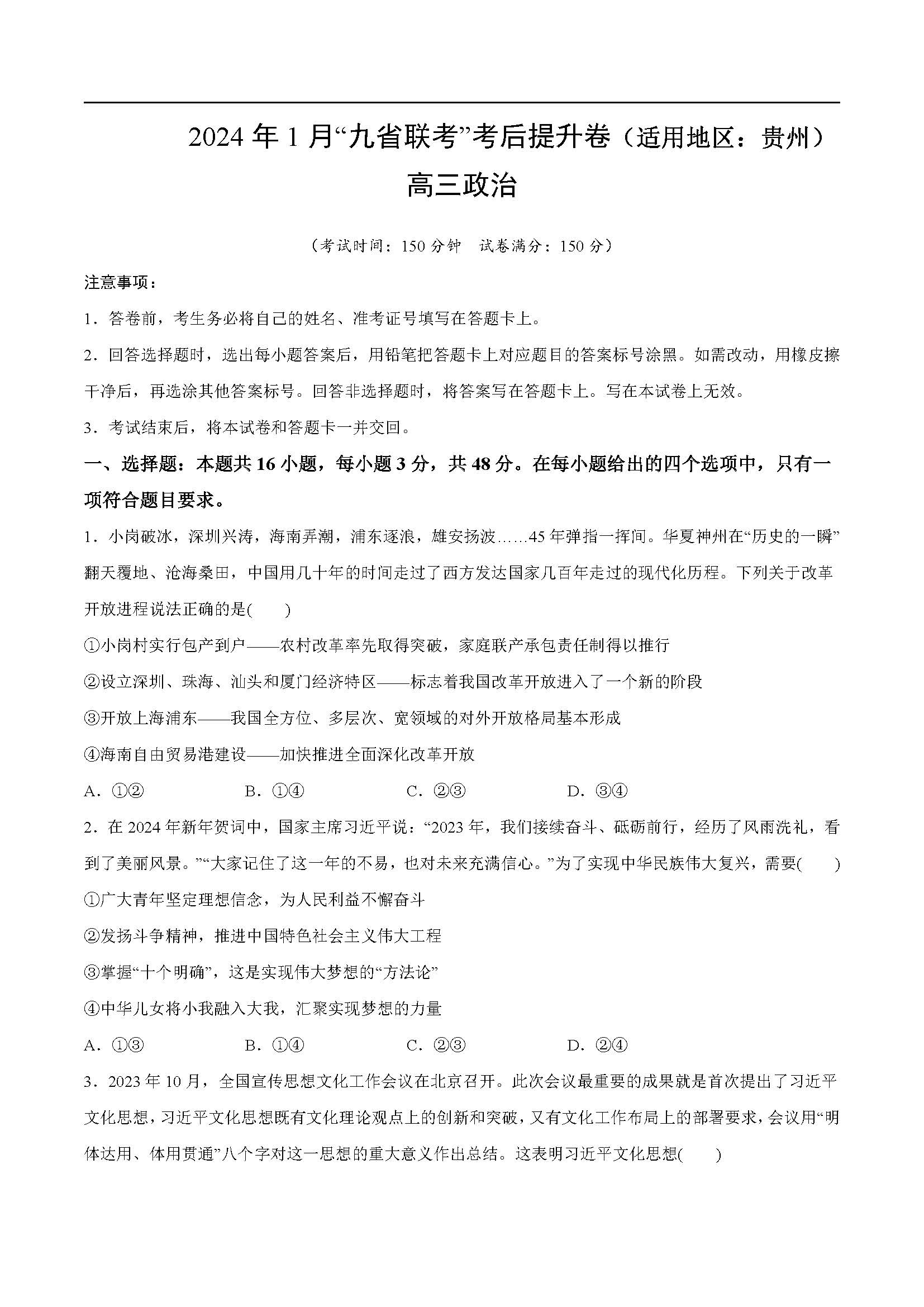 2024年1月九省联考考后提升卷政治试题(贵州卷)