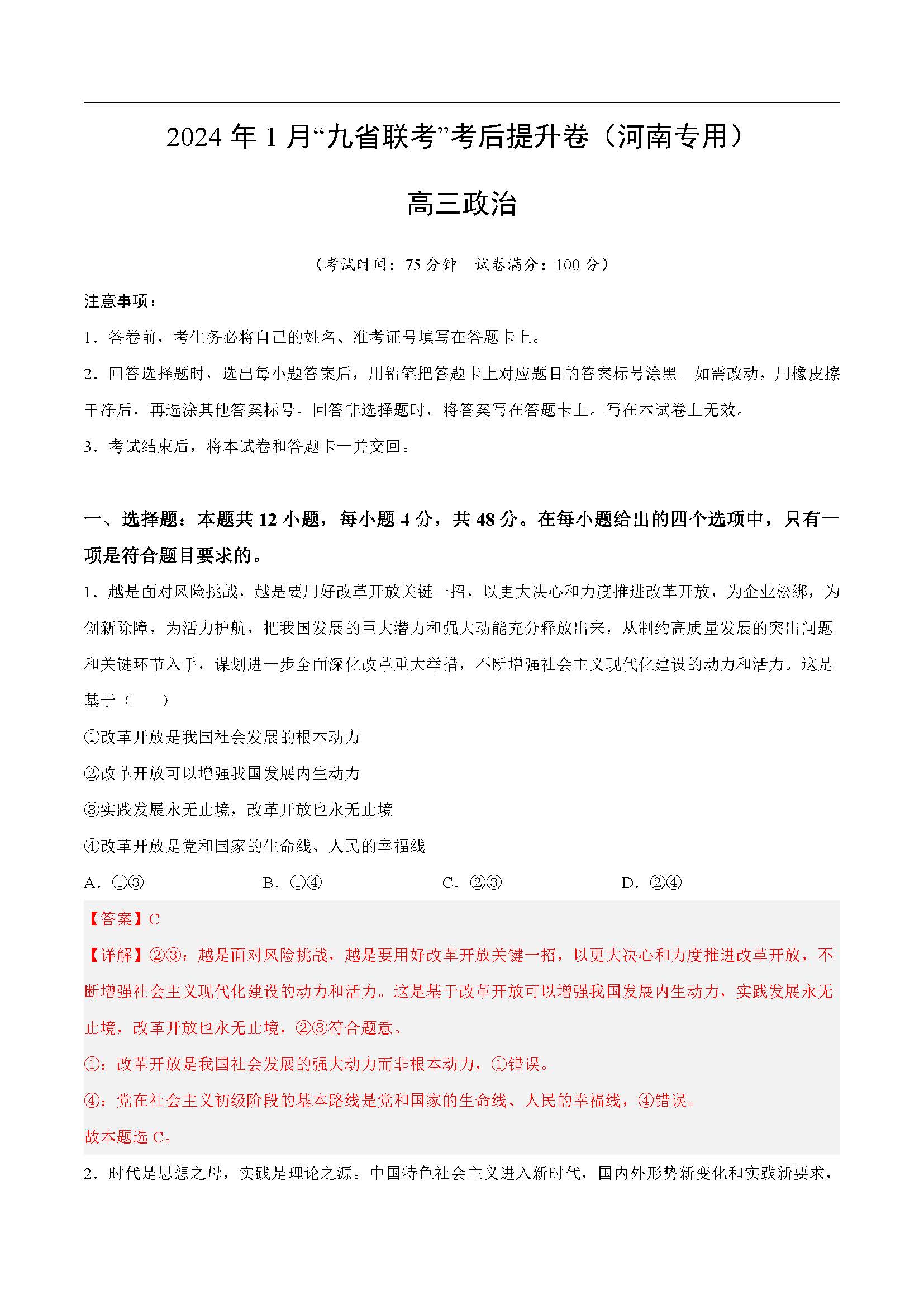 2024年1月九省联考考后提升卷政治答案(河南卷)