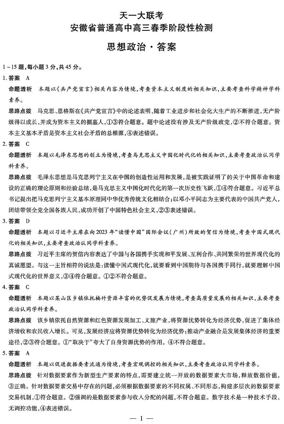 2024天一大联考皖湘名校高三春季阶段性检测政治试题及答案