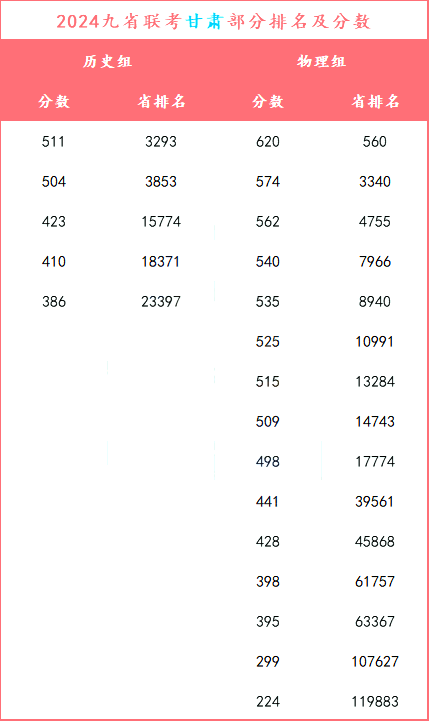 本文整理了2024九省联考甘肃部分排名及分数,供考生参考。2024新高考七省联考定于2024年1月19日开考,据最新消息,河南、新疆也加入了这次7省联考,也可称为九省联考。本文整理了2024九省联考甘肃部分排名及分数(非官方数据),仅供参考。