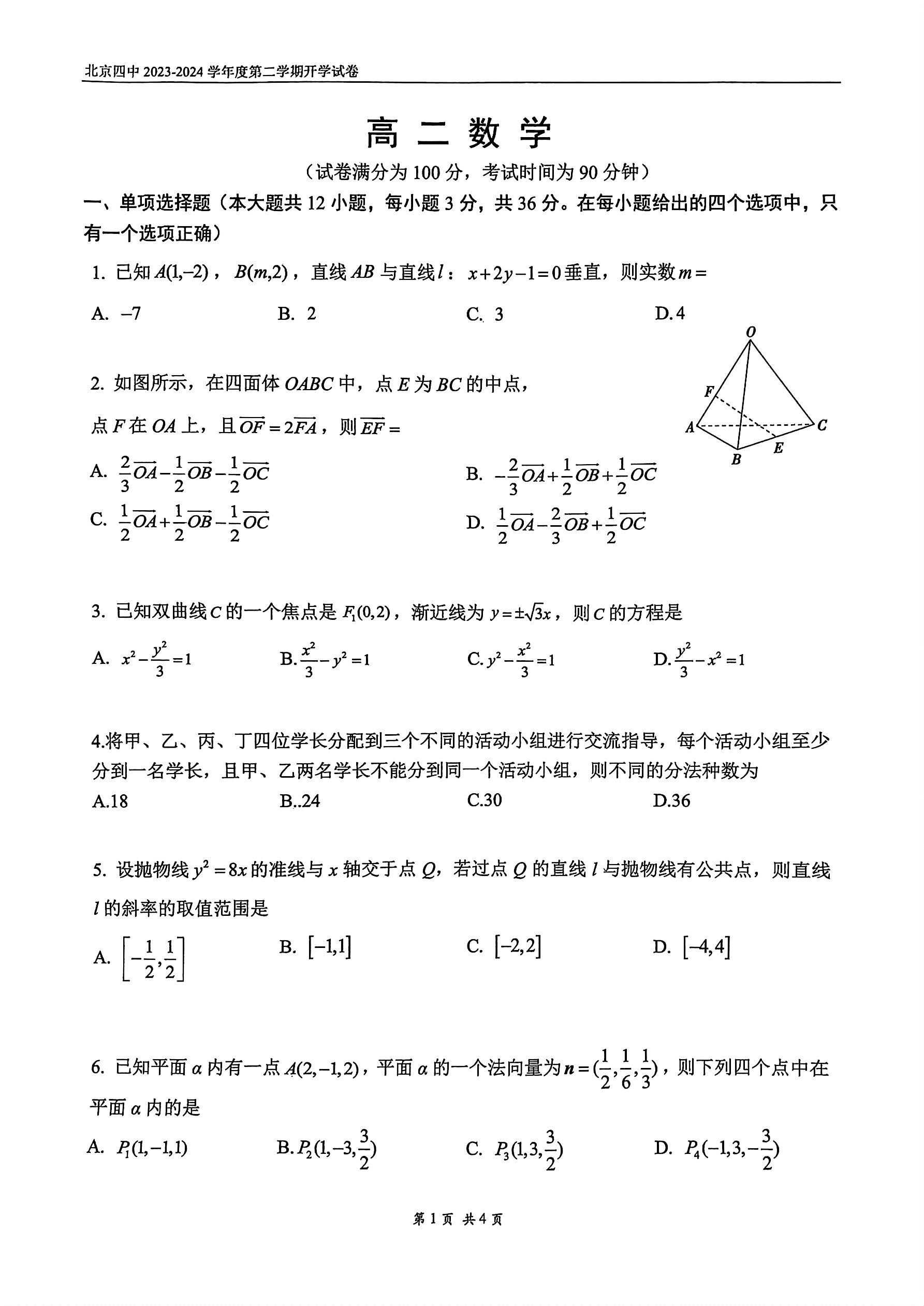 2023-2024学年北京四中高二2月开学考数学试题及答案